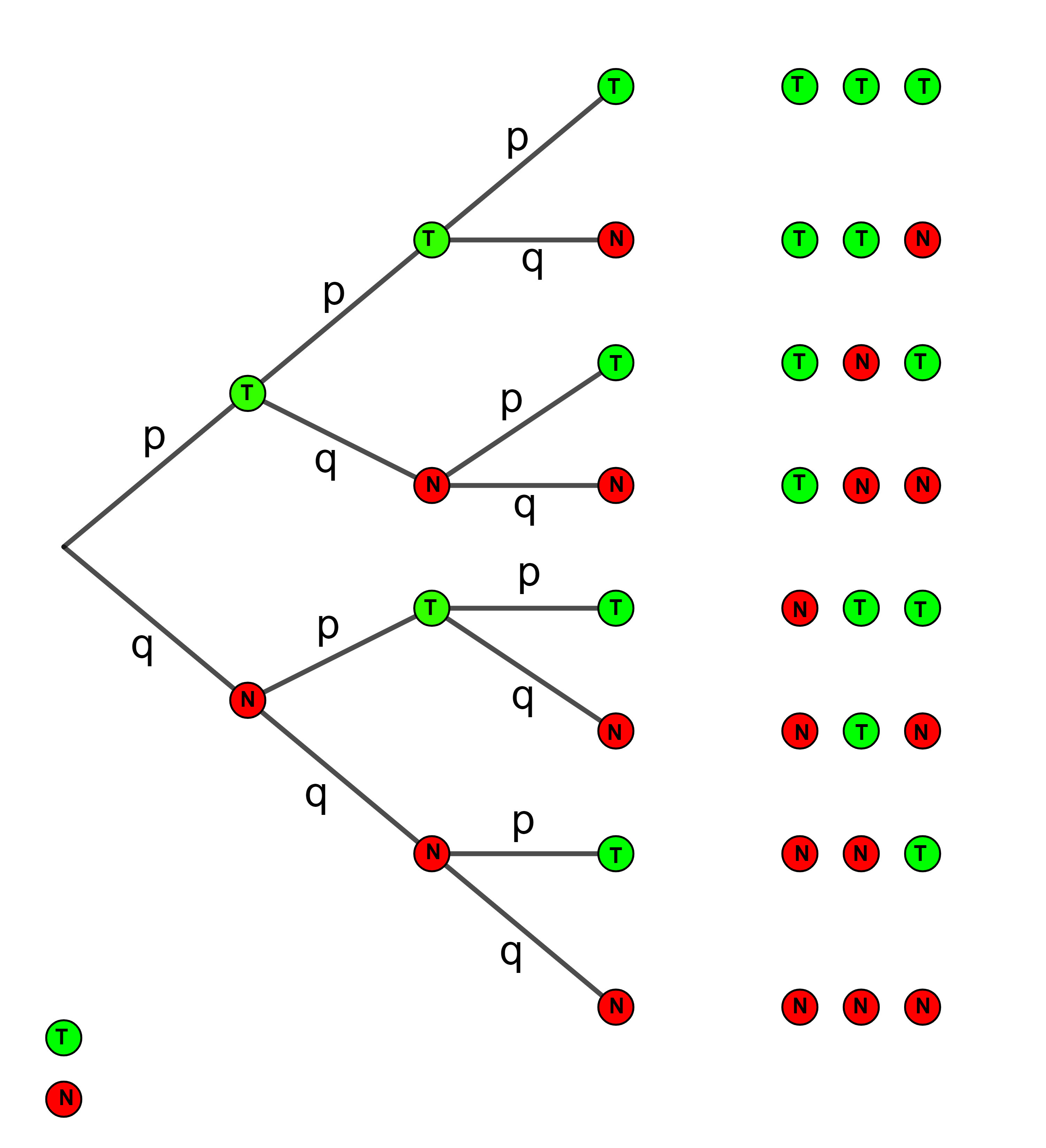 Nachfolgend ist ein typisches Baumdiagramm zu einer Bernoulli-Kette der Länge n = 3 mit der Wahrscheinlichkeit p für einen Treffer und der Wahrscheinlichkeit q = 1 - p für eine Niete abgebildet: