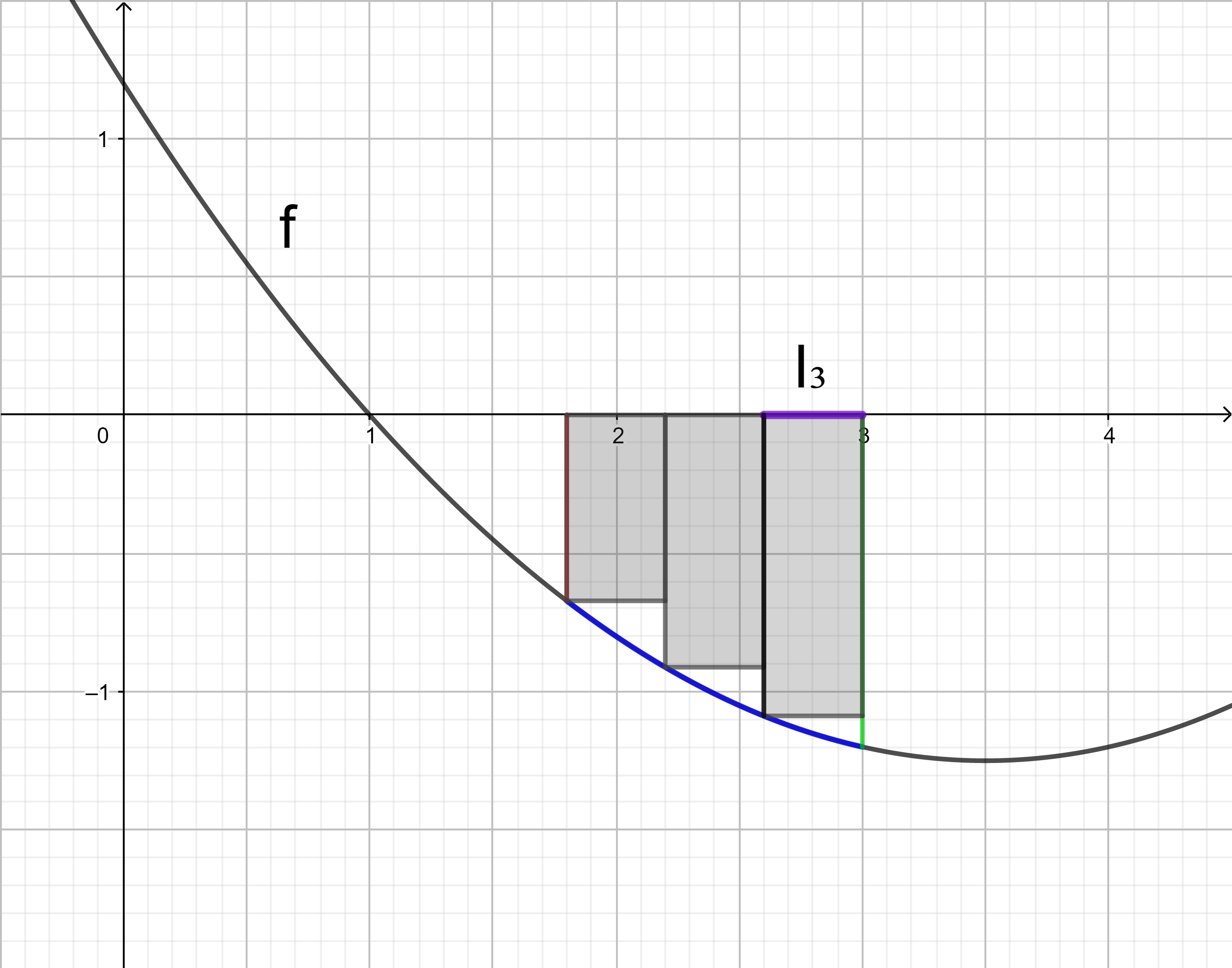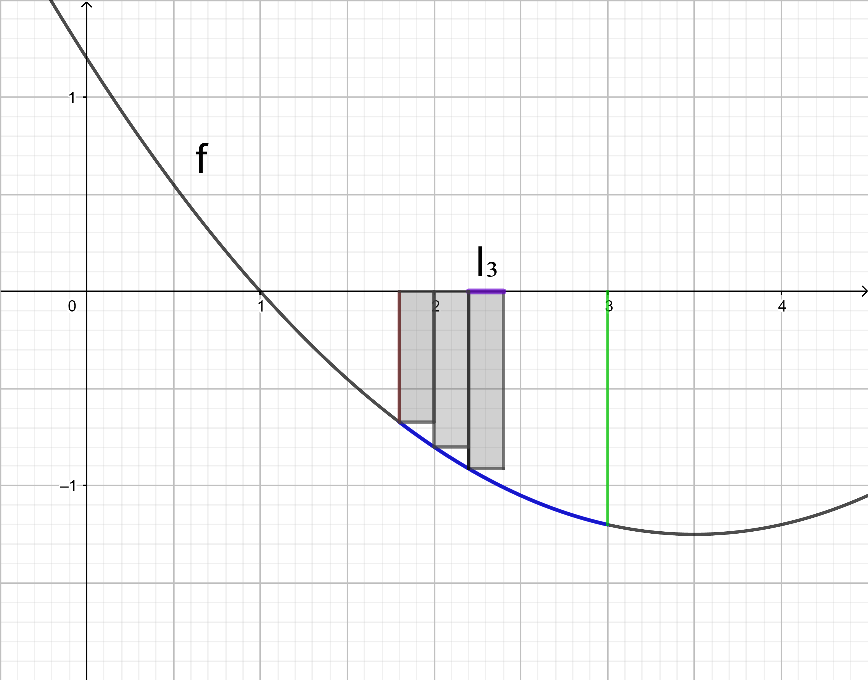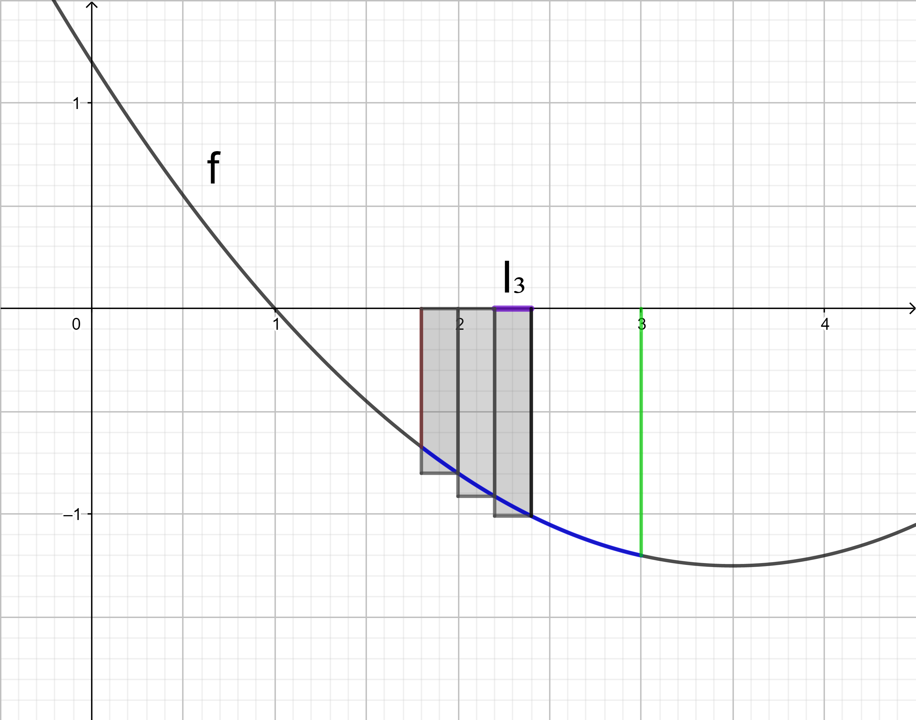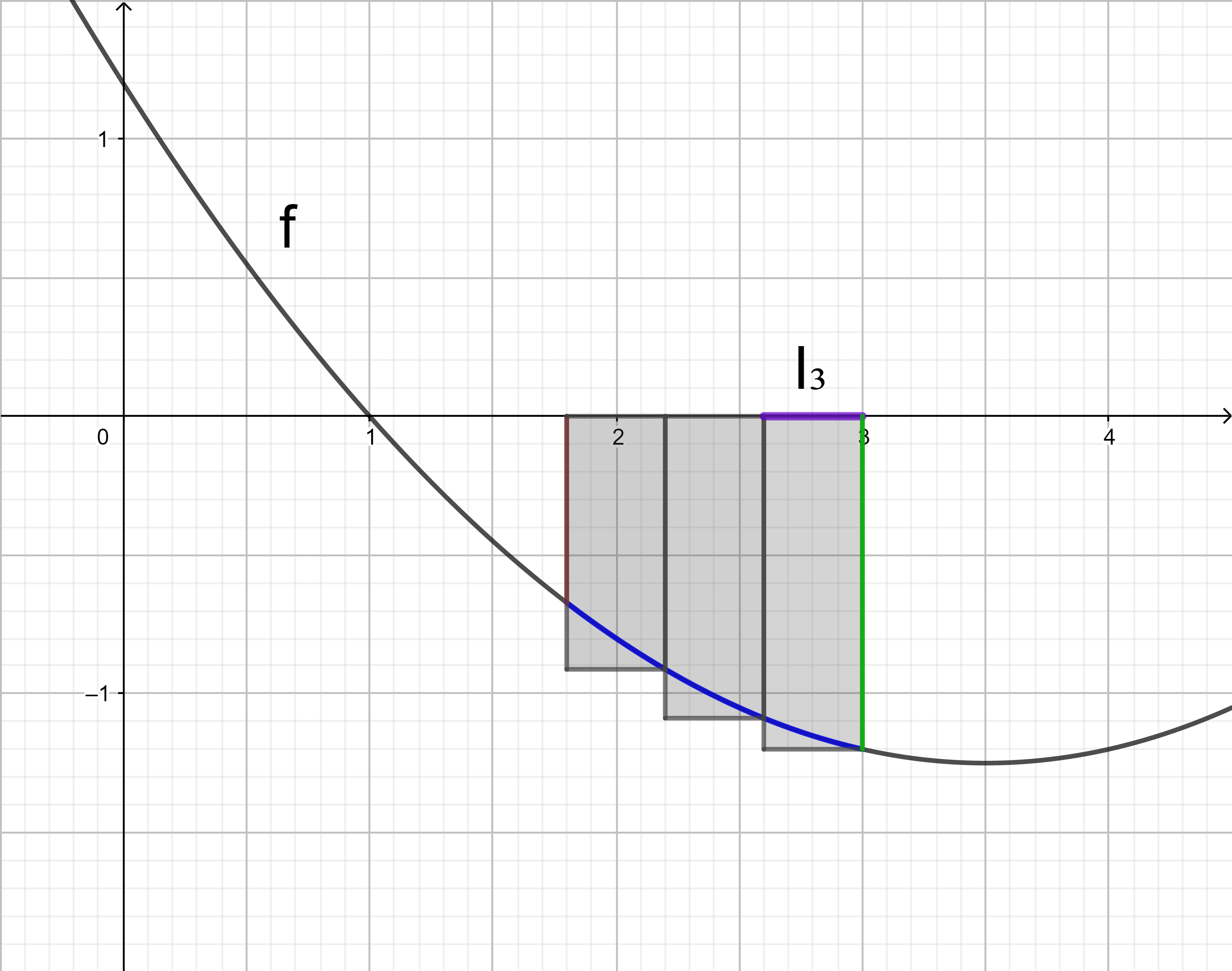 Da die Untersumme U3 kleiner als der gesuchte Integralwert sein soll, wird in jedem Teilintervall I1, I2, I3 der kleinste Funktionswert gesucht und anschließend ein Rechteck mit der Breite 0,4 und dem Betrag des kleinsten Funktionswerts als Länge gezeichnet.