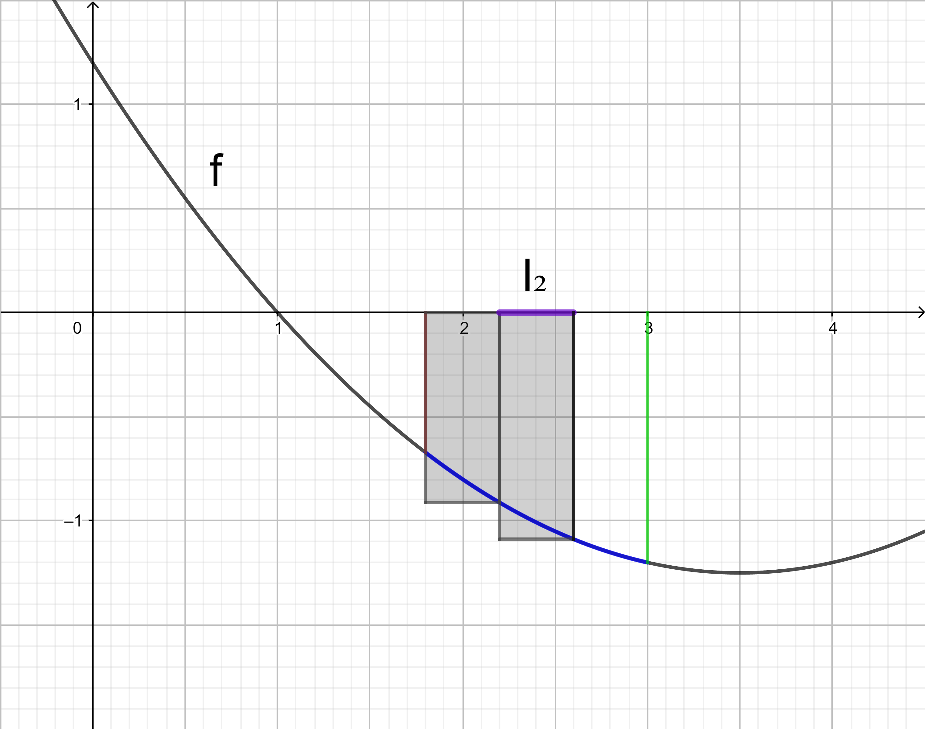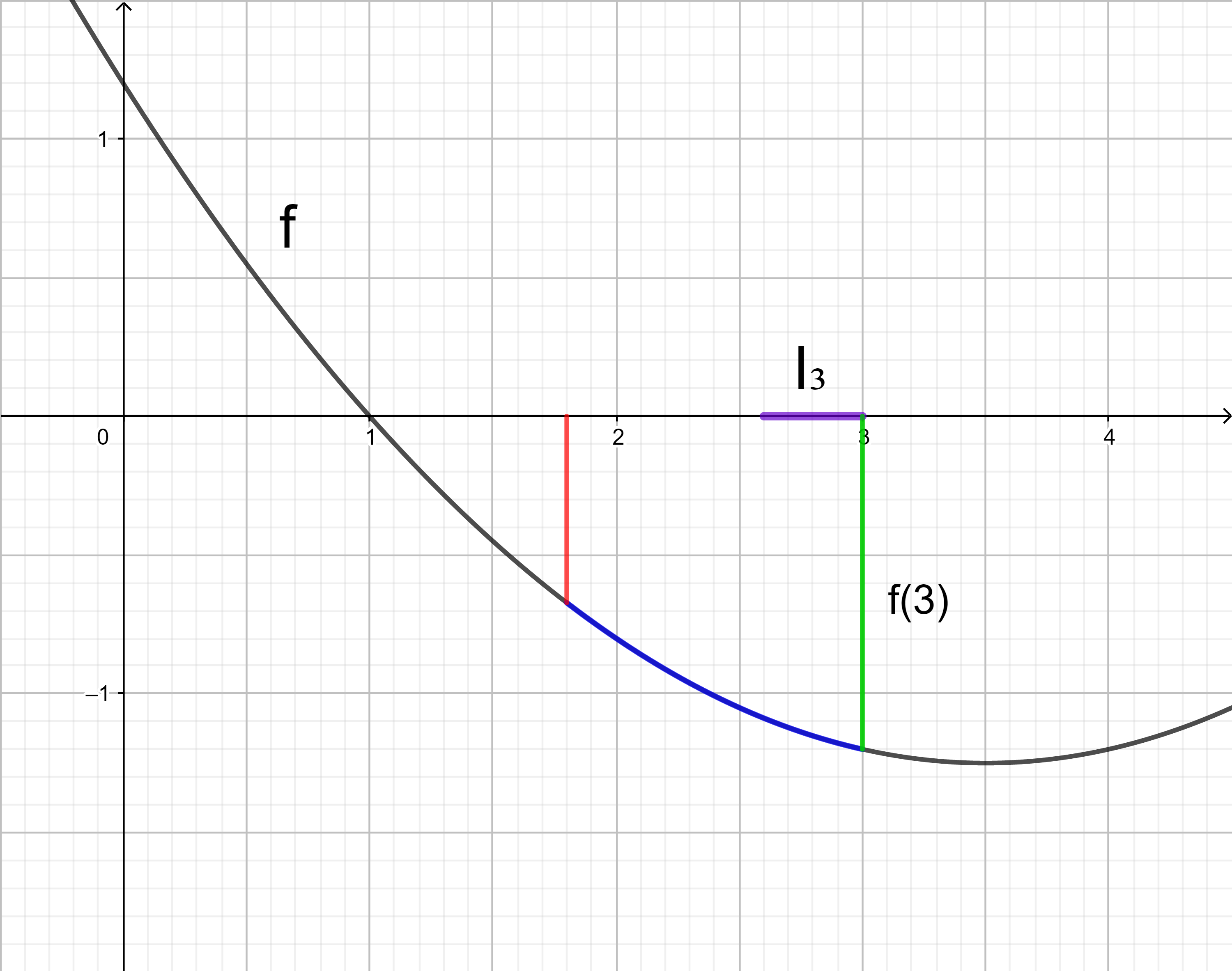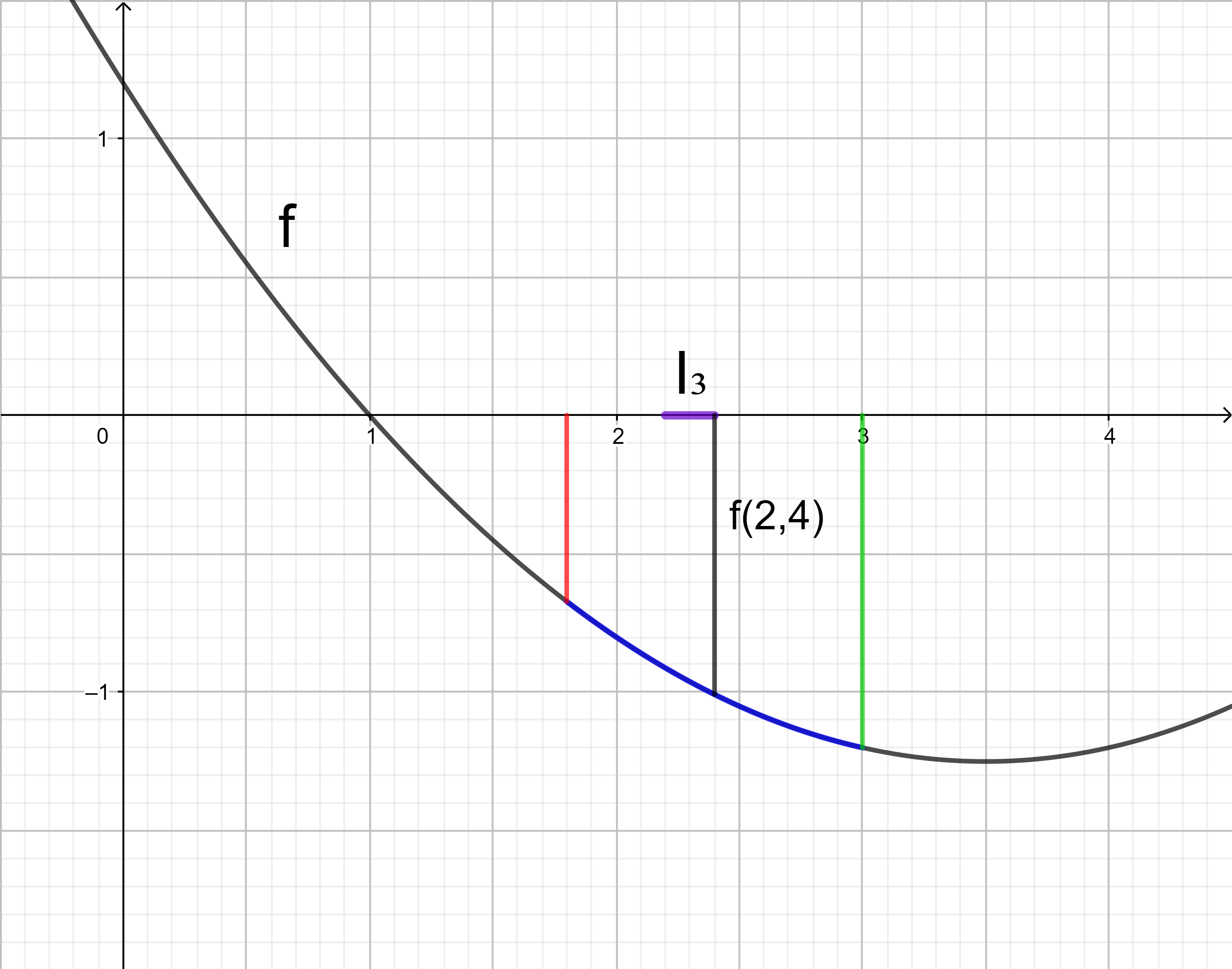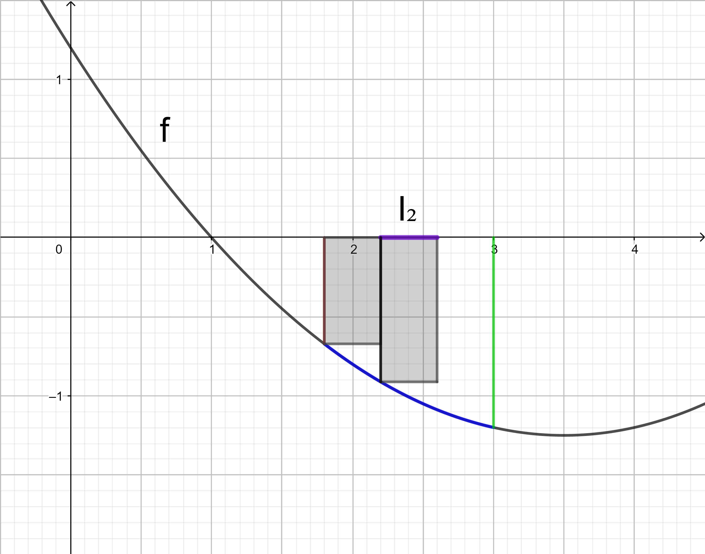 Da die Untersumme U3 kleiner als der gesuchte Integralwert sein soll, wird in jedem Teilintervall I1, I2, I3 der kleinste Funktionswert gesucht und anschließend ein Rechteck mit der Breite 0,4 und dem Betrag des kleinsten Funktionswerts als Länge gezeichnet.