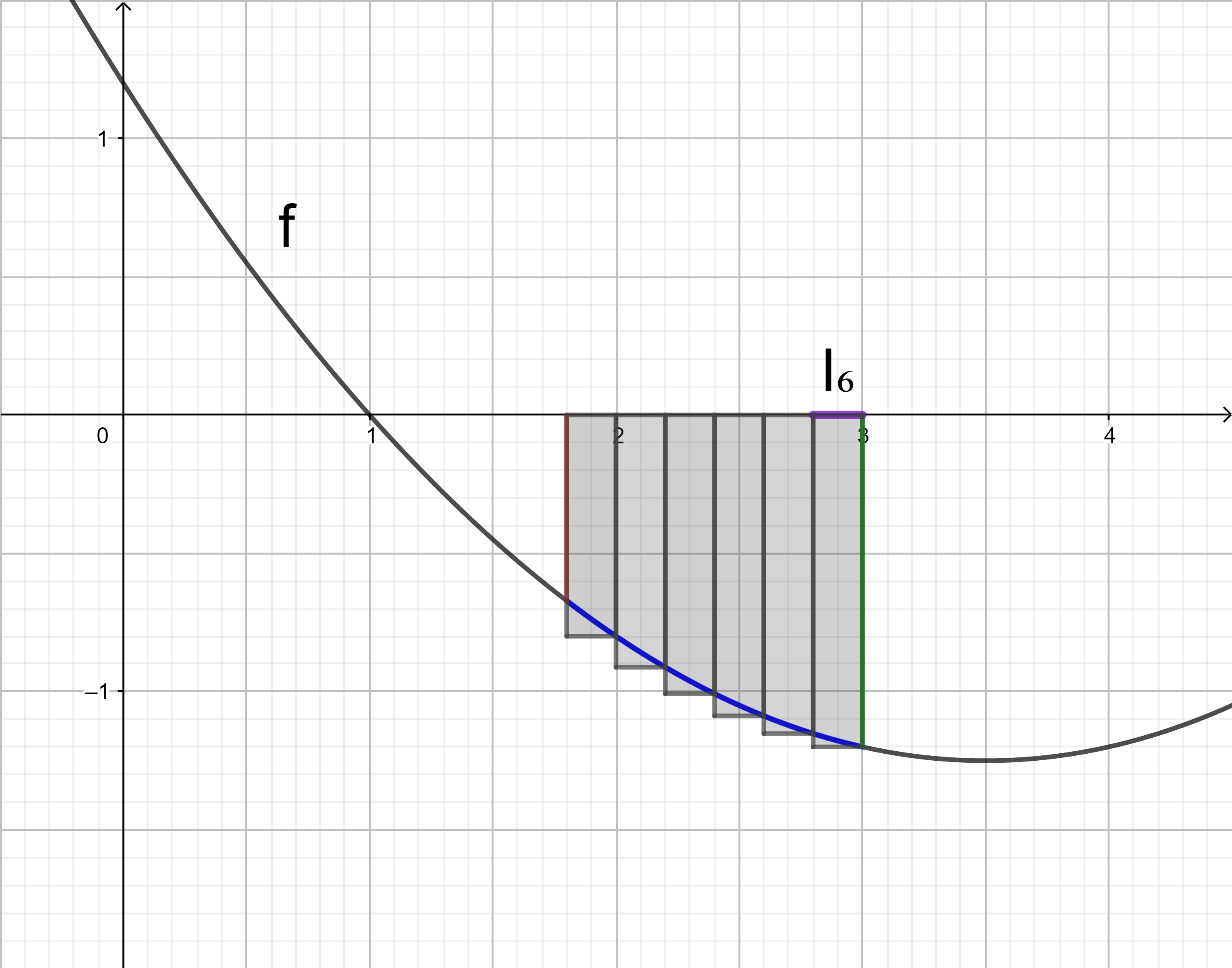 Die Rechtecke, die zu den Unter- und Obersummen, mit denen der Integralwert näherungsweise ermittelt werden kann, gehören, liegen ebenfalls unterhalb der x-Achse. Deshalb ist auch der orientierte Flächeninhalt der Rechtecke negativ.