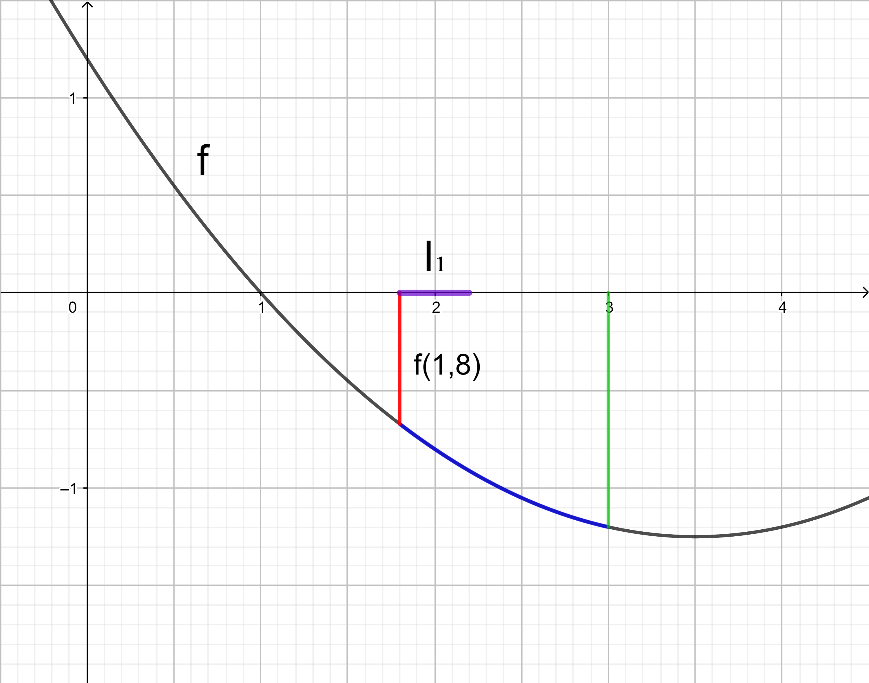 Die Strecke zwischen den Integrationsgrenzen, also zwischen 1,8 und 3, wird in drei gleiche Teile geteilt.