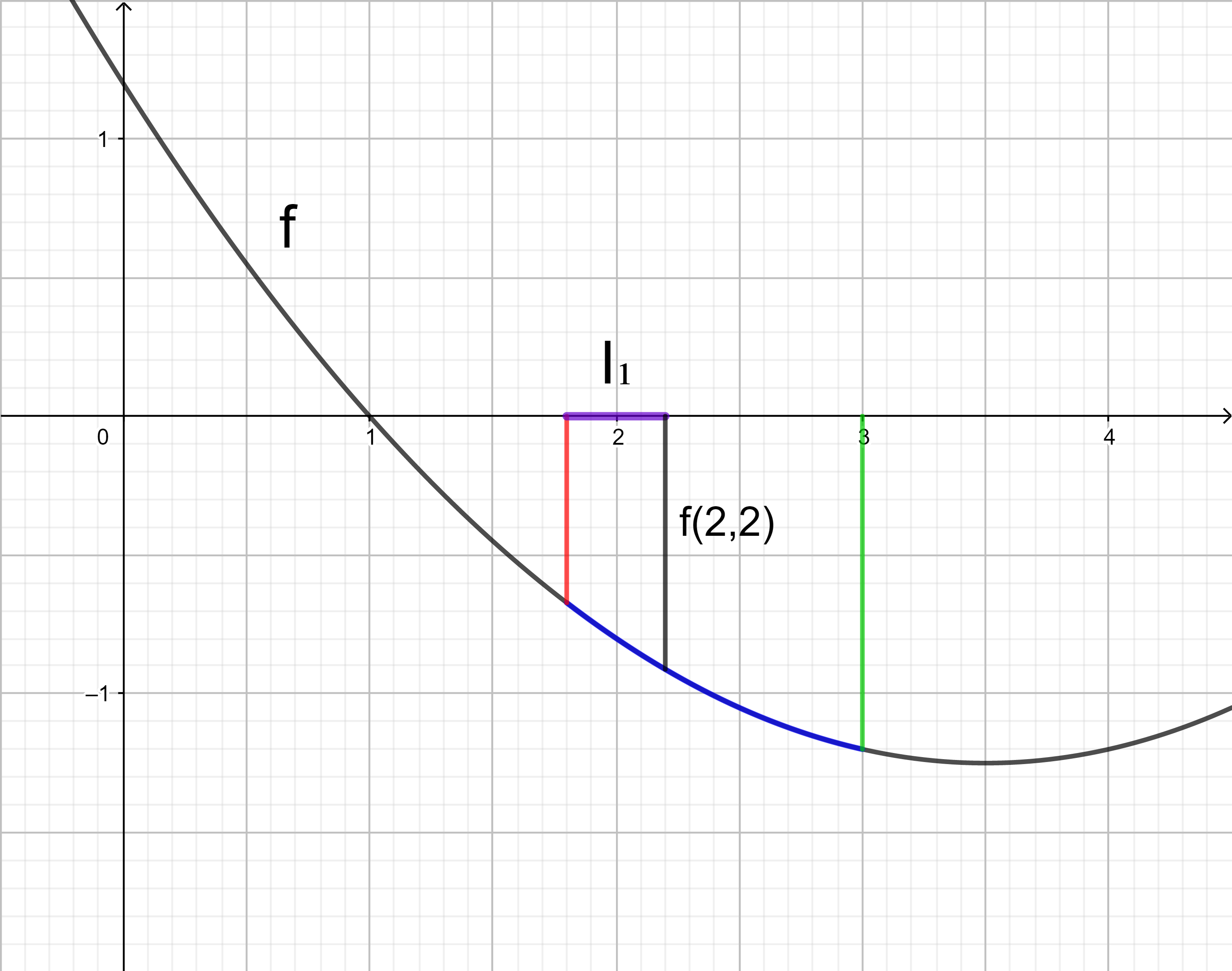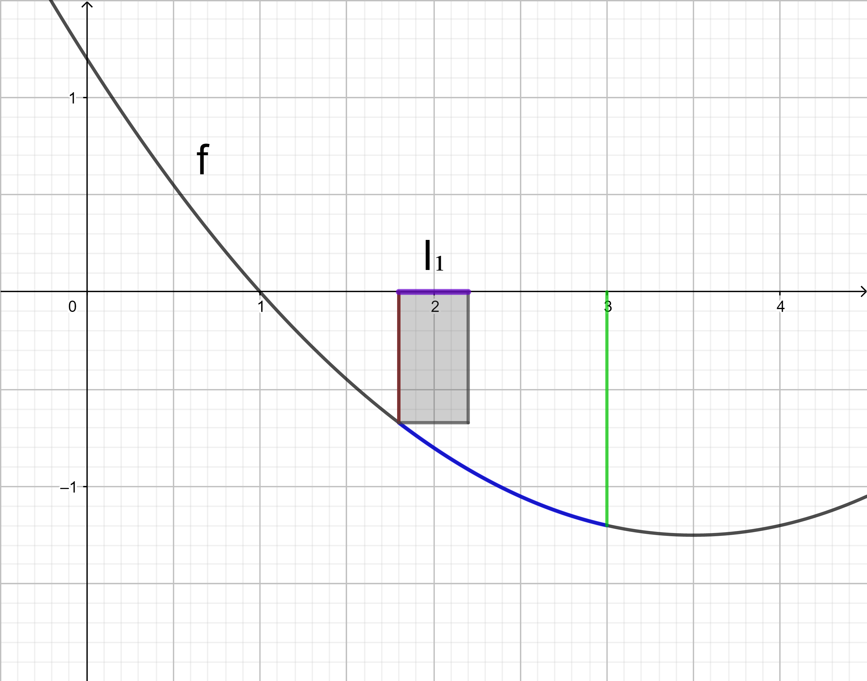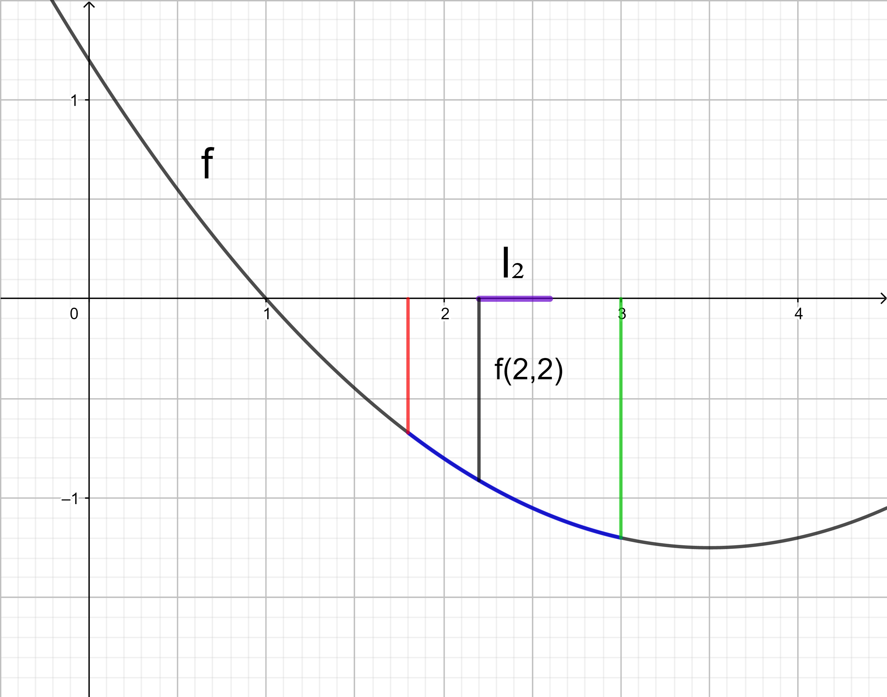 Das Rechteck im Intervall I1 hat den orientierten Flächeninhalt 0,4 ⋅ f(2,2). Er ist negativ, da f(2,2) negativ ist.