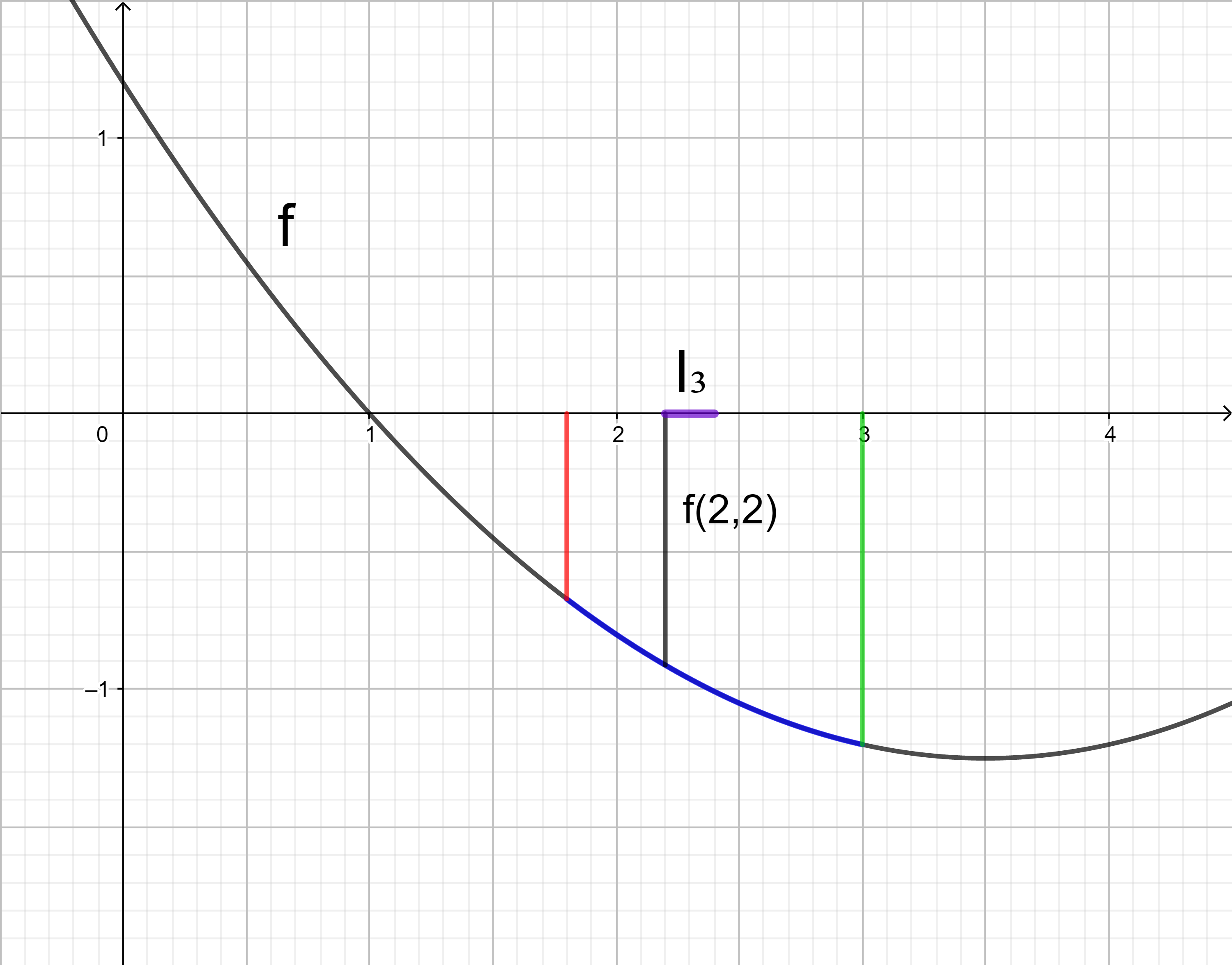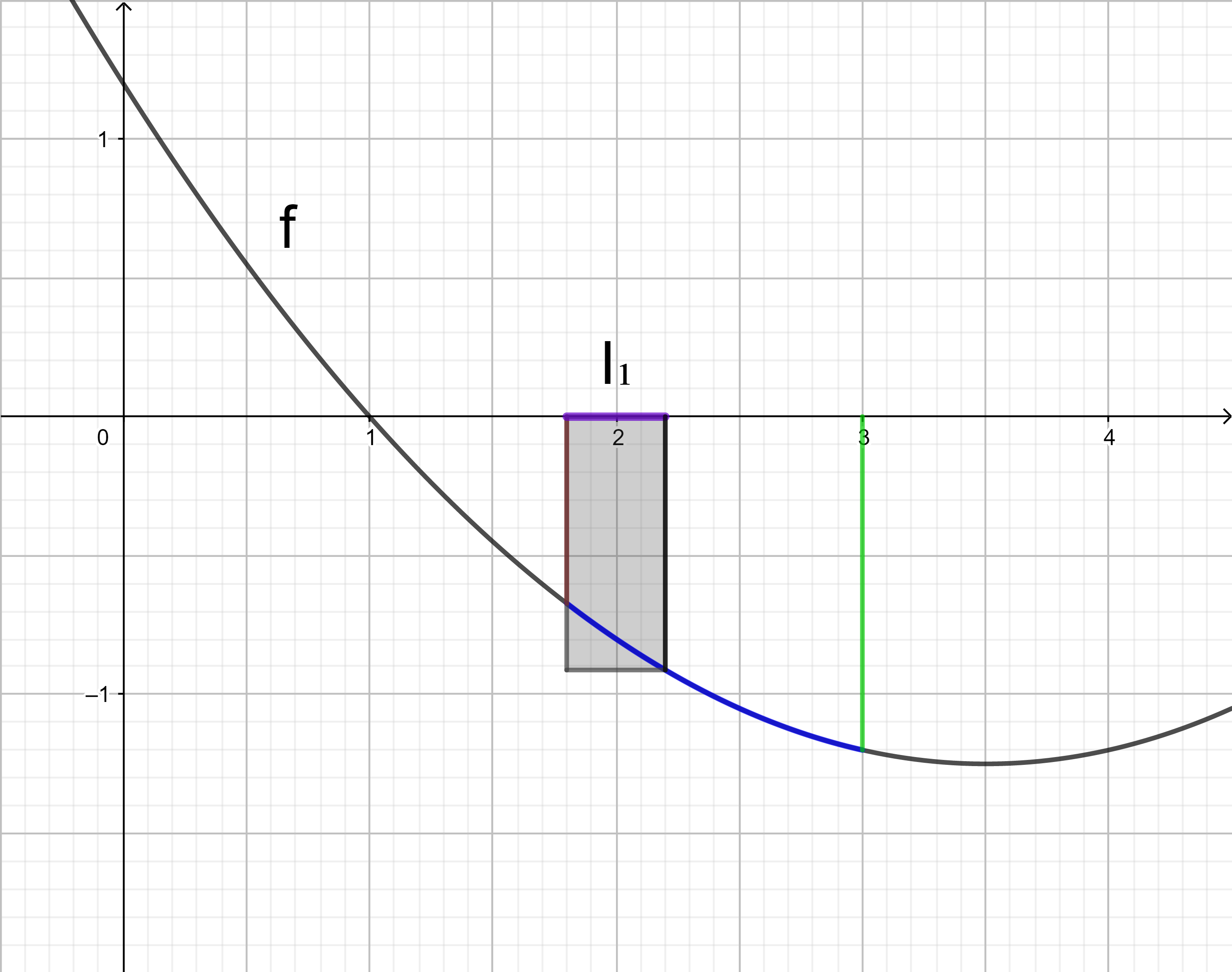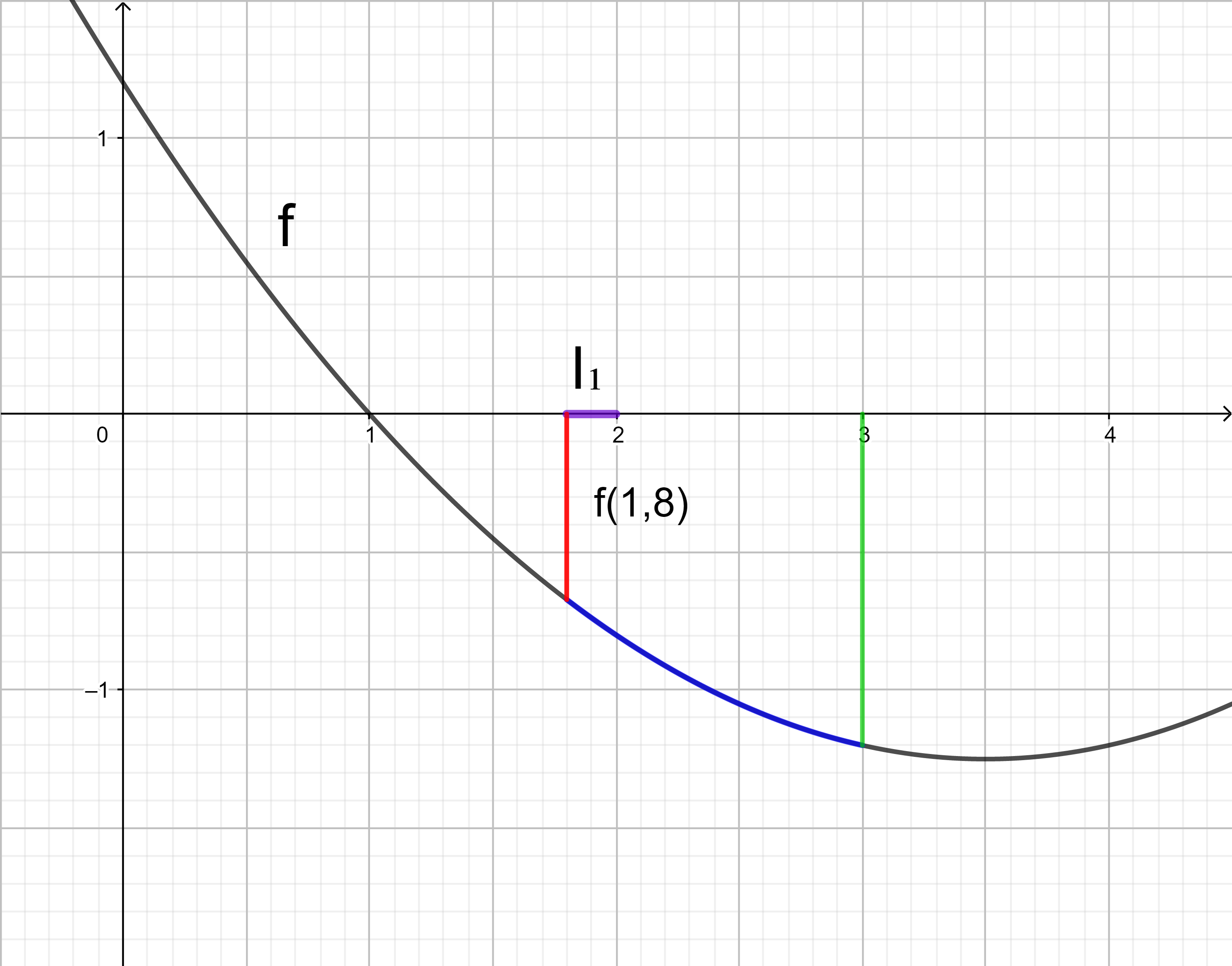 Das Intervall [1,8 ; 3] wird in drei Teilintervalle I1, I2, und I3 unterteilt, zu denen jeweils ein Rechteck gehört.