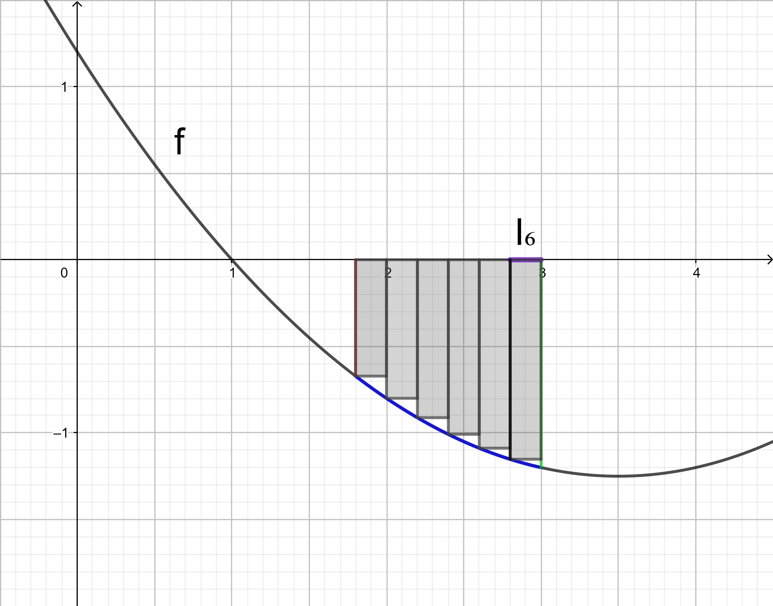 Die Konstruktion der Rechtecke zur Obersumme O6 entspricht der Konstruktion der Rechtecke zur Obersumme O3 (Betrag des größten Funktionswertes als Länge des Rechtecks) und zur Untersumme U6 (0,2 als Breite des Rechtecks).