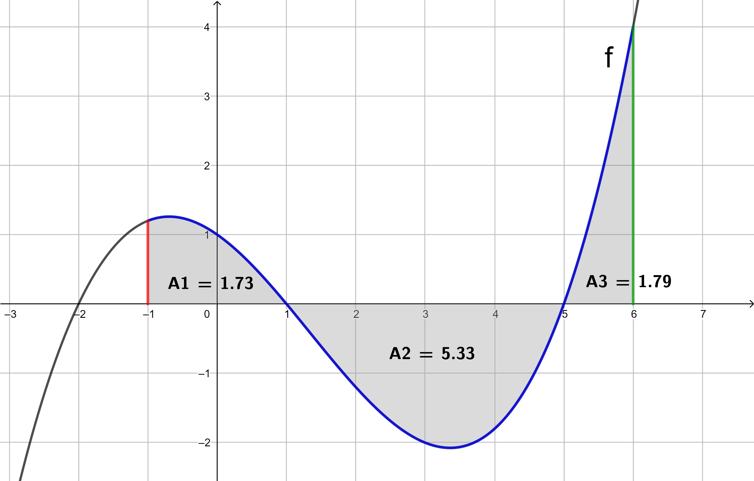 Der Graph von f begrenzt im Intervall [-1 ; 6] mit der x‑Achse drei Flächenstücke, die entweder oberhalb oder unterhalb der x‑Achse liegen. In der nachfolgenden Zeichnung sind die jeweiligen Flächeninhalte (in FE = Flächeneinheiten) angegeben.