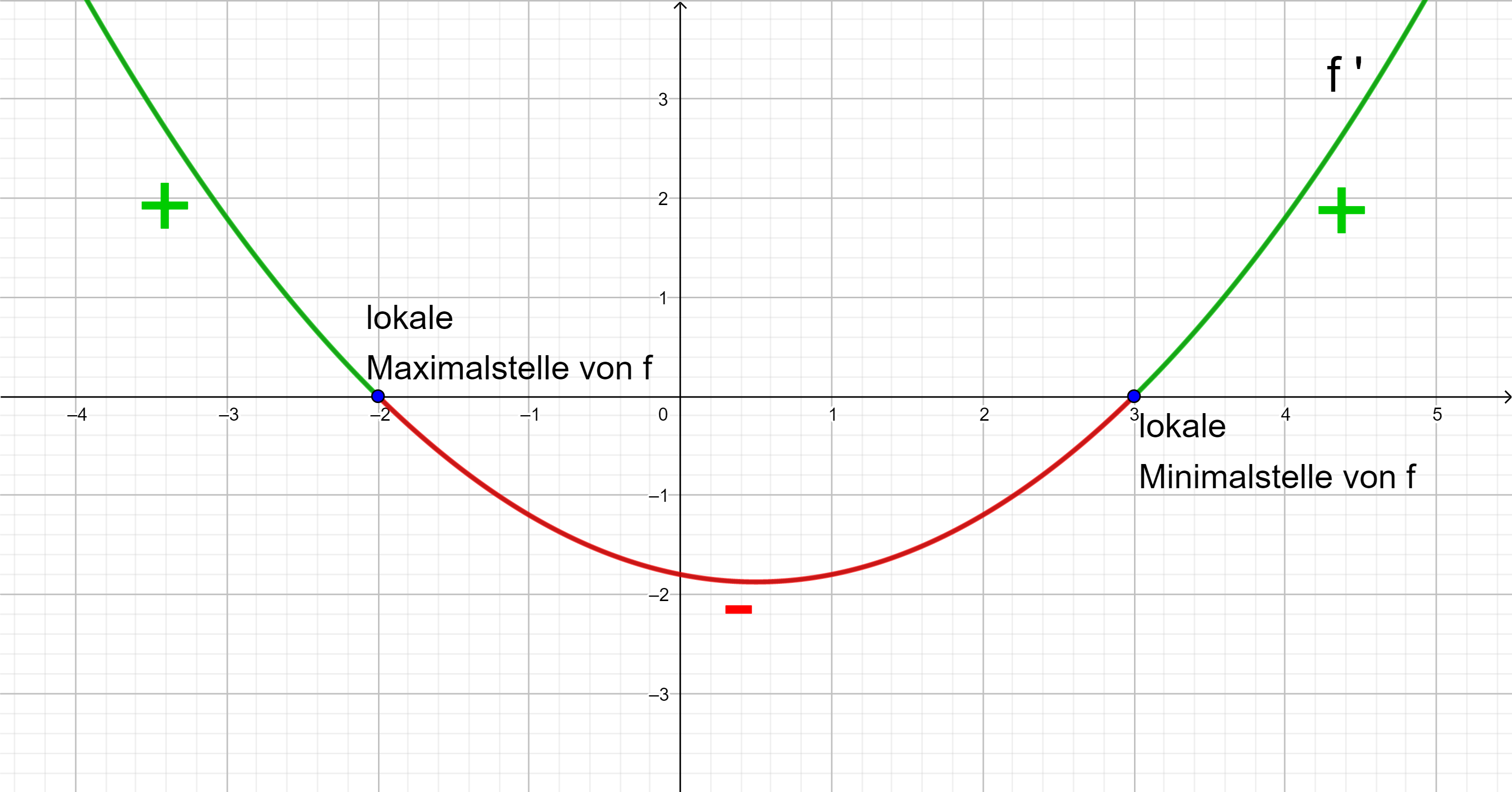 Die Steigung der Tangente wird mit der 1. Ableitung von f berechnet. Die x-Koordinate jedes Extrempunktes (genannt "Extremstelle") muss somit die Gleichung f '(x) = 0 erfüllen.