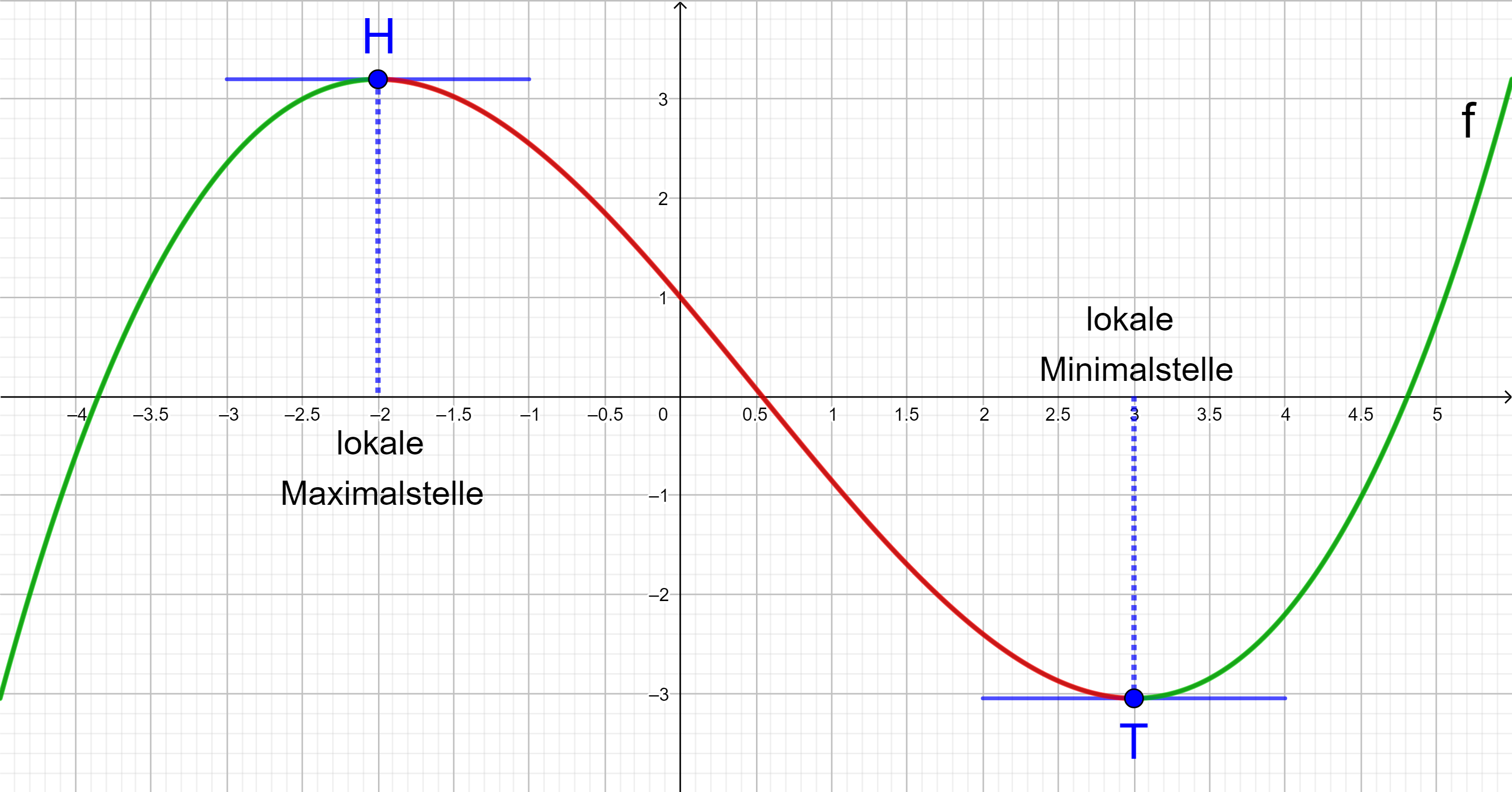 In allen lokalen Hoch- oder Tiefpunkten einer Funktion f ist die Tangente an den Graphen von f waagerecht, d. h. die Steigung der Tangente ist 0.